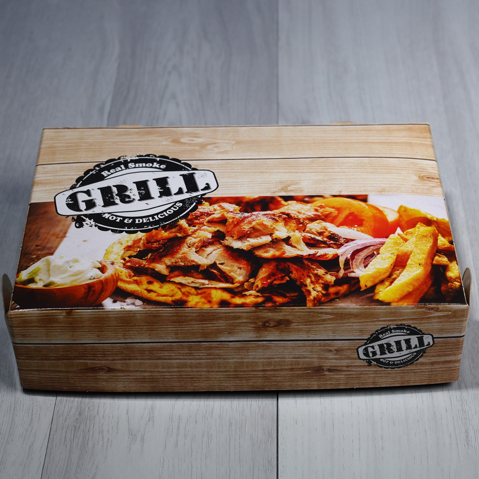 The T44 grill box is a takeaway container commonly used by restaurants and grill houses in Greece. It is specifically designed with a foil-lined interior to keep grilled foods hot and fresh.Â