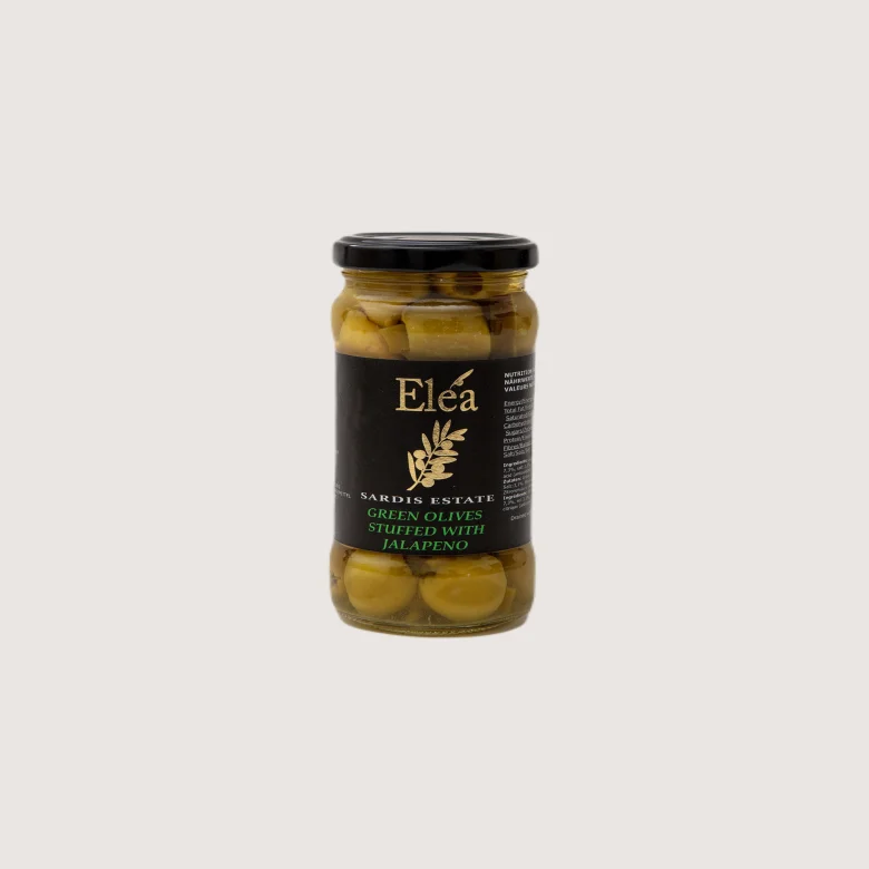 Green olives:45,3%, water:44,1%, jalapeno:7,3%, salt:3,1%, lactic acid (acidifying agent):0,12%, citric acid (antioxidant):0,08%