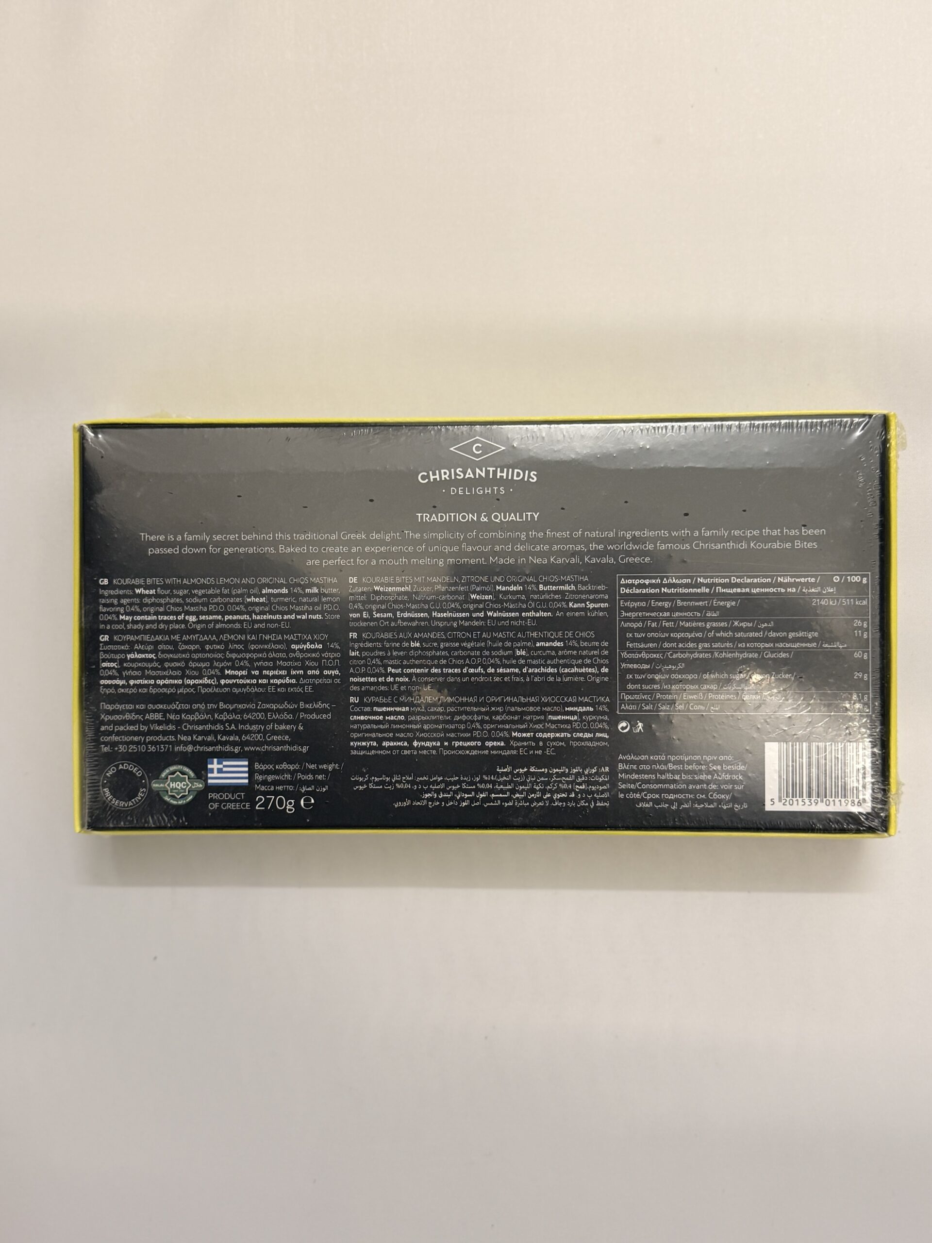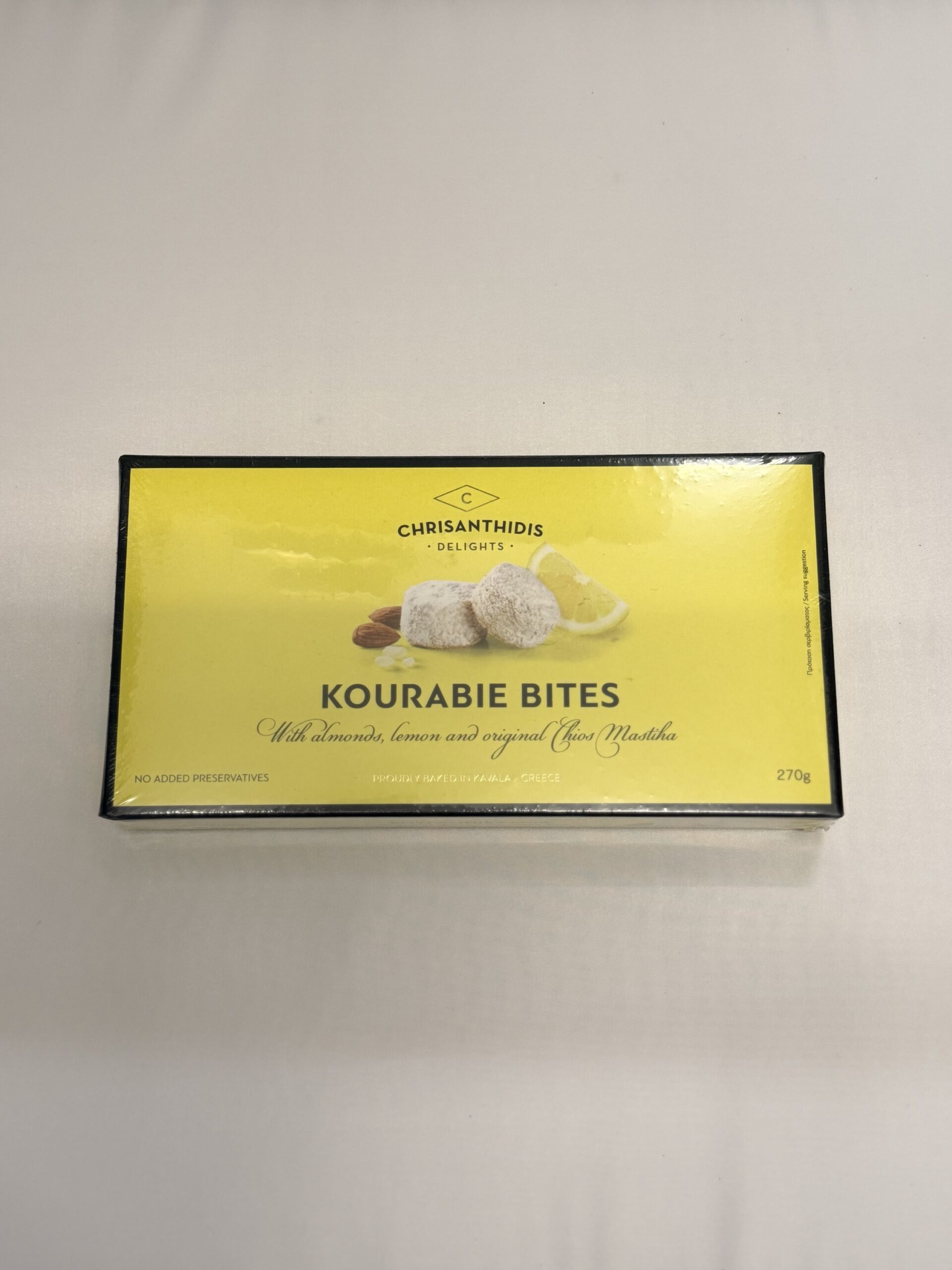 Kourabie, also known as butter cookies, almond cookies, or Greek cookies, is a traditional Chrisanthidis delight. Behind its recipe lies a “family secret” while the simplicity of combining pure ingredients has been passed down from generation to generation. The refreshing aroma of lemon meets the distinct character of mastiha in a combination that brings a modern twist to a beloved classic. Its small round shape makes it a perfect choice for a sweet delight, any time of the day.