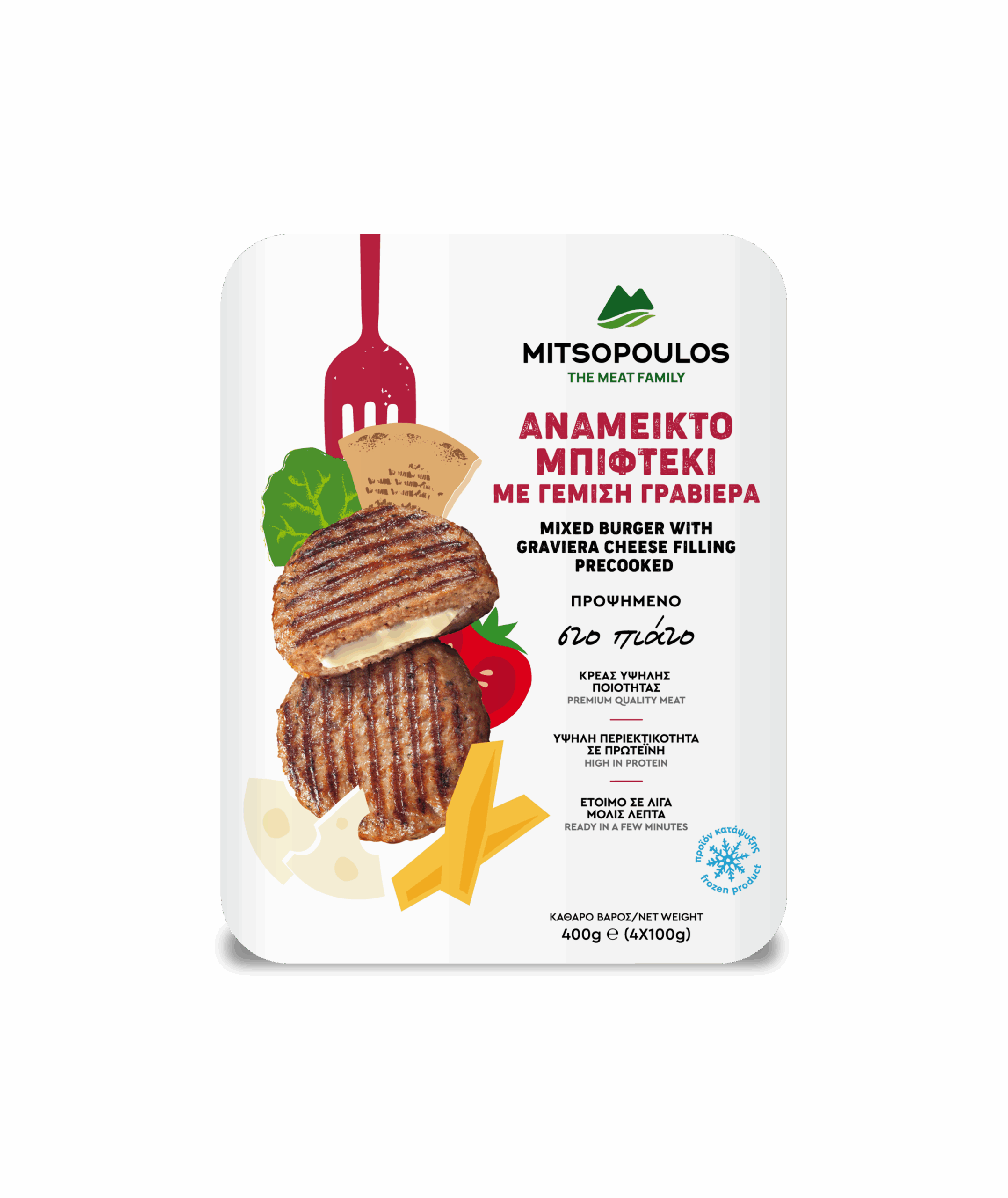 Mitsopoulos produces a pre-cooked, mixed-meat burger with cheese, imported from Greece, offering a convenient and authentic taste experience. This product is a variation of the traditional Greek patty known as bifteki. The term “mixed burger” refers to the combination of ground beef and pork, a common practice in Greek cuisine to achieve a balanced flavor and moisture.Â