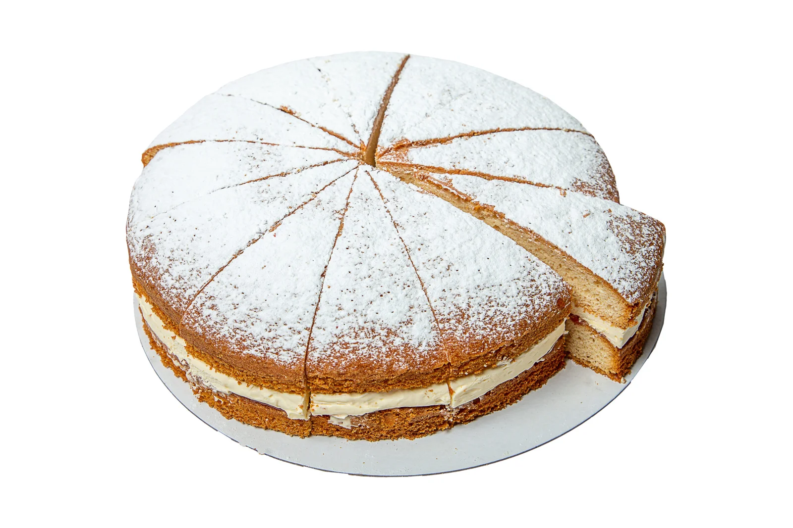 A Victoria sponge is a classic British cake consisting of two layers of soft, airy sponge cake. The layers are sandwiched together with a filling of strawberry or raspberry jam and, traditionally, a layer of fresh whipped cream, though vanilla buttercream is also common. The top is finished with a simple dusting of icing sugar.